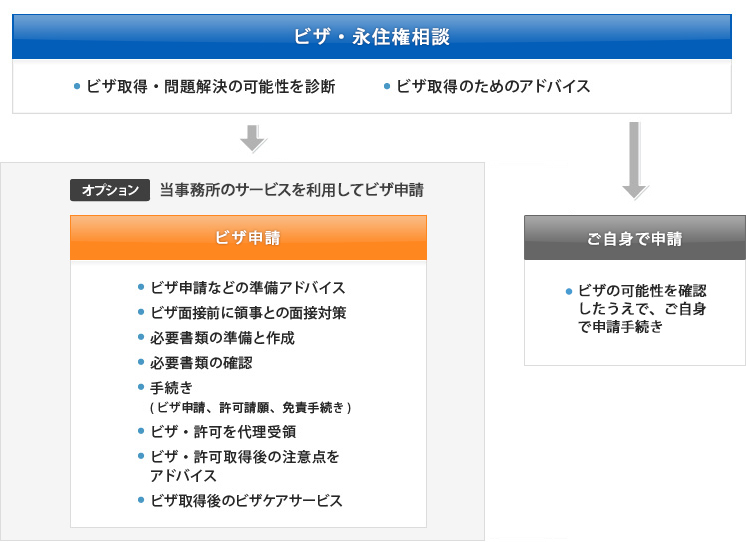 - 法律相談(ビザ・永住権)後のビザ申請手続きサポートに関しましては、ビザ申請サービスをご覧下さい。