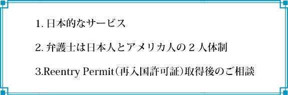 当事務所は日本人、アメリカ人の2人の弁護士が連携してReentry Permit申請手続を進めさせていただいております。