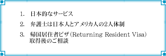 当事務所は日本人、アメリカ人の2人の弁護士が連携して帰国居住者ビザ(Returning Resident Visa)申請手続を進めさせていただいております。